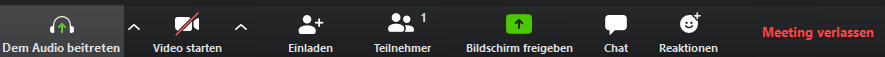 - Wenn Du an den unteren Rand von Zoom fährst erscheint unten ein Menü. Du siehst die Anzahl der Teilnehmer*innen und kannst Nachrichten im Chat hinterlassen