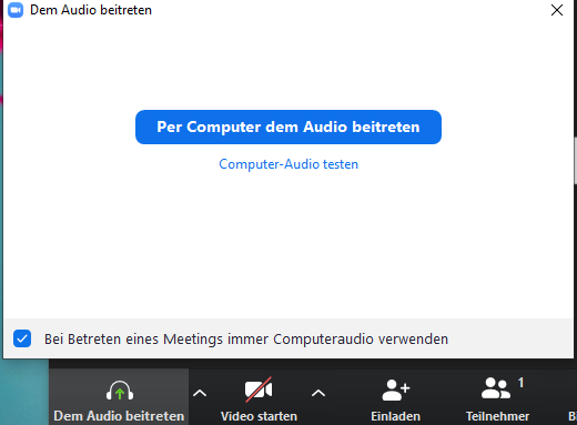 - Wenn Du mit der Maus an den unteren Rand des Fensters fährst siehst Du links unten das Piktogramm mit dem Kopfhörer. Darunter steht: „Dem Audio beitreten„. Dieses musst Du anklicken, damit Audio eingeschaltet wird